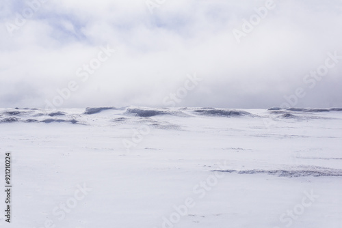 highland snowy plateau, lifeless snowy landscape with hummocks