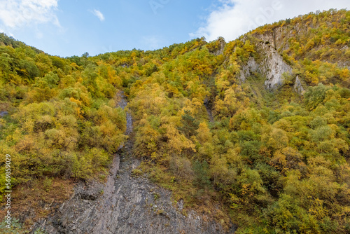 Highlands of North Ossetia. Mountains of the Caucasus. High mountains in the rays of the setting sun.