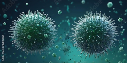 Highly Detailed Digital Illustration of Realistic Virus Particles with Spiked Structures in a Gradient Teal Background