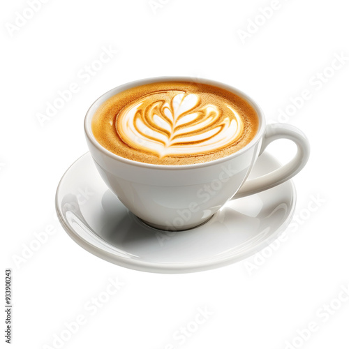Highly realistic advertising photo of a cup of cappuccino coffee with creamy milk and latte art isolated on transparent background