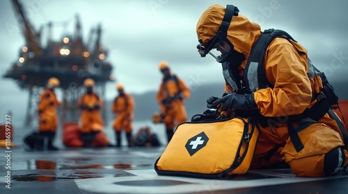 Highly Trained Offshore Rescue Team Practicing Emergency Response Drills and Coordinating Rescue Procedures on the Helipad of an Offshore Oil Platform