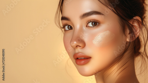 High-quality crop photo of skincare and cosmetics concept with copy space for text. Woman with beautiful face touching healthy facial skin with cream portrait. Beautiful happy Asian girl model with na