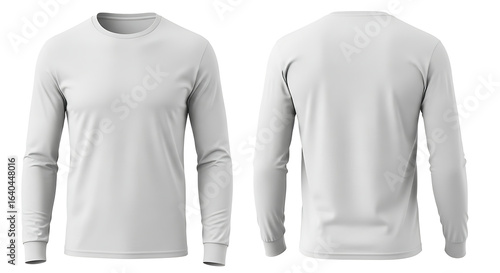 High-quality mockup of a classic white long-sleeve t-shirt, presented with both front and back views on an isolated white background, perfect for apparel design presentations.