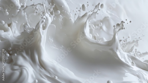 milk, splash, three-dimensional, render, realistic, fresh, dynamic, mid-air, white, background, smooth, creamy, texture, natural, fluid, motion, elegant, swirl, droplet, wave, lighting, soft, diffused, subtile, highlight, shadow, depth, realism, circular, pattern, versatile, branding, advertising, cardboard box, design, clean, quality, visually, striking, dairy, product, promotion, food, marketing, beverage, creative, project