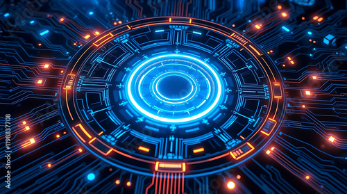 High-Resolution Digital Interface Design: A Futuristic Neon Blue Circular Hub with Cybernetic Rings, Intricate Circuits, Glowing Data Streams, and Dynamic Connectivity in a Sophisticated Dark Blue Bac