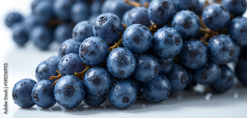 High-resolution image of wet blue grapes, clustered naturally, isolated on white, glossy surface, sharp and vivid presentation.