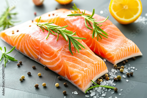 High-resolution raw salmon fillet with black pepper, rosemary and lemon