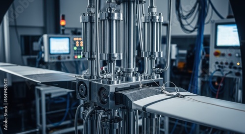 Highresolution shot of fatiguetesting rigs hydraulic system exerting fluctuating forces on helicopter rotor blade composite material.