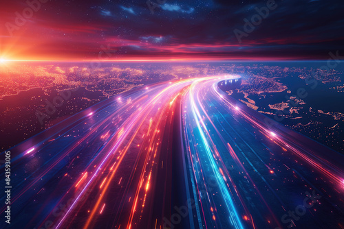 Highspeed global data transfer visualized as light trails across continents, scifi theme