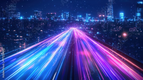 High-speed light trails on a city background with futuristic neon colors, a night view of tall skyscraper buildings and a highway road in a modern urban business district.