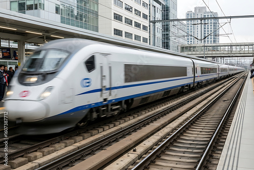 train, high speed, modern, transport, railway, station, platform, track, railroad, speed, motion, fast, urban, city, building, architecture, travel, journey, commute, passenger, future, technology, sleek, white, blue, grey, infrastructure, public, transit, express, movement, powerful, efficient, contemporary, blur, dynamic, departure, arrival, daylight, people, asia, china, locomotive, vehicle, business, industry