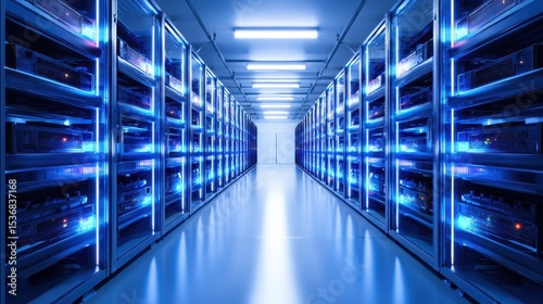 High-tech data center with illuminated server racks and a clear pathway in a modern facility