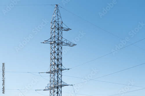high-voltage power lines against a blue sky