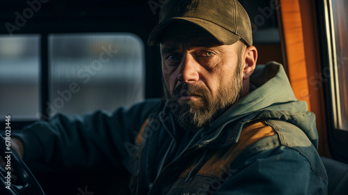 rugged, cross country, transportation, freight, rig, highway, cargo, logistic, hauling, heavy duty, travel, delivery, semi-truck, road trip, expressway, truck driver, commercial vehicle, ai, generative, person, photogenic, people, guy, hat, face, 1, beard, closeup, business, serious, men at work, man, car, expression