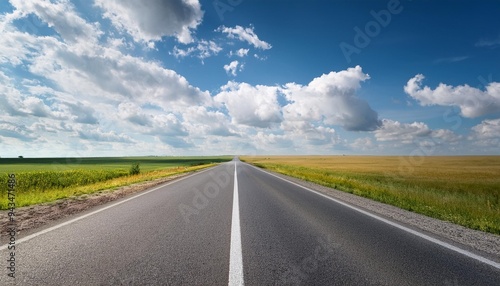 highway in the grassland background of blue sky and bright clouds long road stretches into the distance empty street on a beautiful sunny day