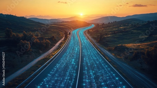 highway, network, digital, datum, sunset, mountain, landscape, technology, future, connection, speed, travel, communication, innovation, stream, light, blue, line, road, path, progress, sunrise, aerial, perspective, modern, design, overlay, high-coloured, glowing, path, speedway, infrastructure, seamless, concept, connectivity, advancement
