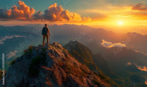 Hiker on a Mountain Peak Admiring the Golden Sunset Over a Mountain Range