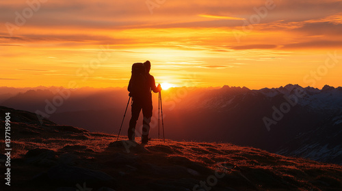 Hiker silhouetted against a stunning sunrise, glowing horizon blending warm and cool tones, peaceful mountain landscape