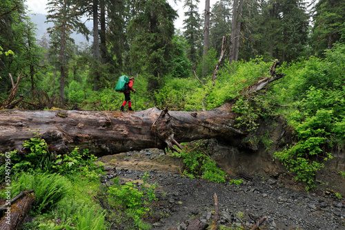 adventure, backpacker, day, fallen tree, full-length, hiking, horizontal, nature, one person, outdoors, rainforest, recreational pursuit, us, walking, young adult