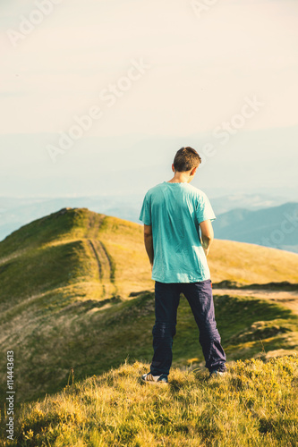 road, mountain, man, boy, hiker, path, forest, infused, landscape, hill, way, travel, nature, high, summer, rough, slope, meadow, blue, background, tree, view, field, rural, countryside, walk, route, mount, curve, uphill