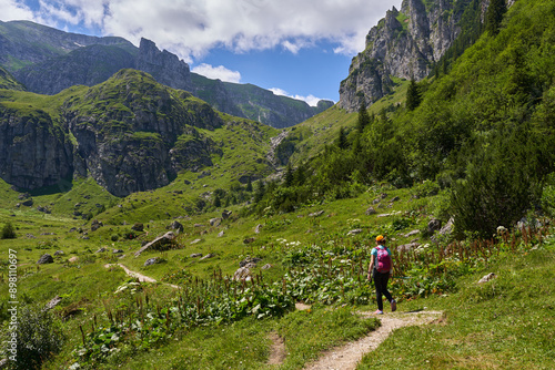 Hiker with backpack and poles on a trail in the mountains