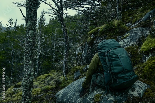 hiker, backpack, forest, rock, sitting, resting, adventure, travel, exploration, nature, outdoors, wood, tree, landscape, wilderness, trekking, hiking, tour tourism, vacation, journey, destination, environment, conservation, moss, overcast, weather, climate, season, fall, autumn, person, male, man, solitude, calmness, peaceful, quiet, serene, scenic, view, altitude, mountain, hill, climb, expedition, gear, equipment, backpack, backpacker