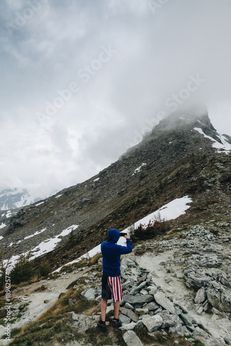 Hiker with short pant American Flag Taking photo with his smart phone to the panorama in the mountain.