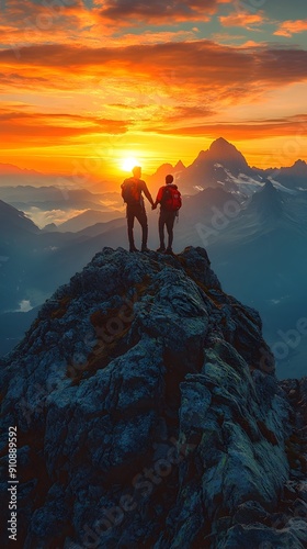 Hikers Assisting Each Other Reach Mountain Peak at Vibrant Sunset