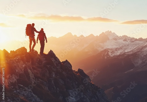 success, peak, sunset, hiker, mountain, summit, adventure, trekking, exploration, nature, sky, horizon, landscape, teamwork, outdoors, hiking, silhouette, achievement, journey, challenge, rugged, rock, wilderness, vibrant, sunrise, terrain, backpacking, accomplishment, highland, discovery, expedition, mountain summit, climbing, scenic, travel, goal, cloud, rocky, trail, view, wild, motivation, determination, branding, marketing, campaign, leadership