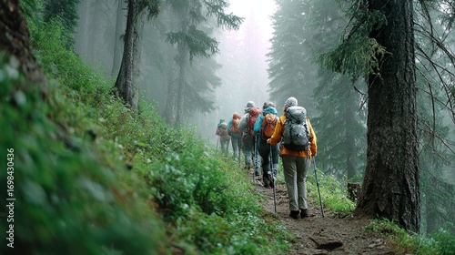 Hikers walking forest trail misty day