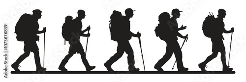 hiker, hiking, silhouette, group, walking, backpack, trekking, pole, adventure, outdoors, nature, travel, landscape, mountain, trail, path, forest, wood, exploration, journey, excursion, expedition, camping, backpacking, climbing, sport, exercise, fitness, healthy lifestyle, tour tourism, recreation, leisure, traveler, wanderlust, freedom, escape, black-and-white, graphic, vector, illustration, design, art, simple, minimalist, isolated, white background