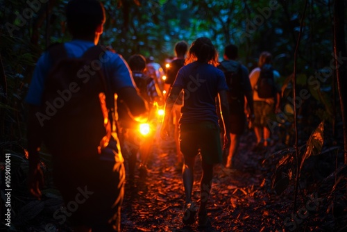 Hikers Walking Through a Forest with Torches at Sunset, Silhouetted Against Golden Light