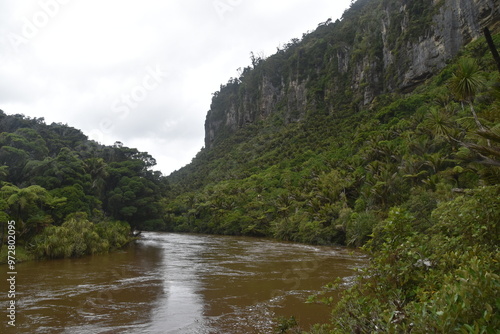 Hiking along the Punakaiki River Track and coastline in the Paparoa National Park, New Zealand