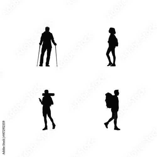 Hiking backpackers silhouettes icon logo set.