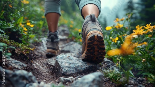 hiking, boot, trail, walking, nature, path, rock, stone, flower, summer, outdoors, adventure, trekking, travel, landscape, foot, footwear, journey, exploration, mountain, scenery, wilderness, green, yellow, active, lifestyle, healthy