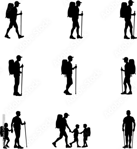 Hiking Hikers Standing on Mountain Peak Silhouette vector graphics
