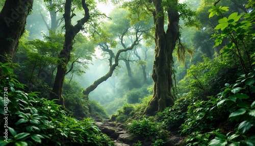 path, hiking, walking, forest, tree, growth, moss, stone, tropical, dense, foliage, plant, green, natural, mist, fog, misty, overgrown, jungle, vegetation, scenic, landscape, environment, nature, timberland, tranquil, serene, travel, tour tourism, exploration, adventure, destination, hike, wilderness, rainforest, lush, greenery, wood