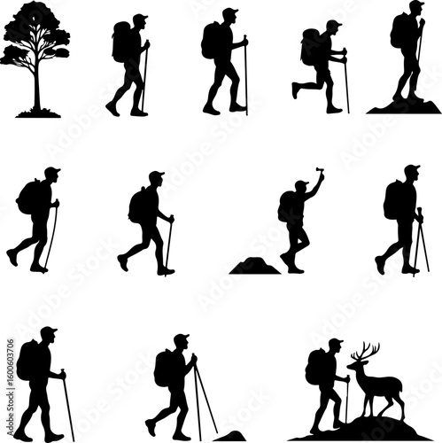hiking, silhouette, group, forest, pine trees, mountain vector bundle