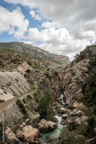 hiking trail caminito del rey, kings walkway, in Malaga Spain. narrow footpath leads through natural beauty mountain range cliff faces of gaitanes gorge. hisotric landmark popular tourist attraction
