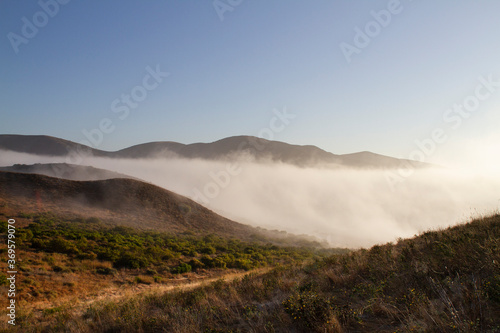 Hiking trail in the Santa Monica Mountains, Point Mugu State Park near Malibu. Climbing from the coast of the Pacific Ocean, hikers can see a panoramic view of the mountains and the ocean.