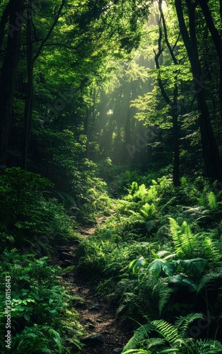 Hiking Trail Through Lush Green Forest with Sunlight Streaming Through Trees