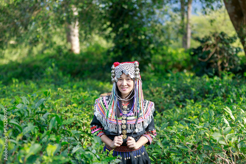 Hill tribe Asian woman in traditional clothes collecting tea leaves with basket in tea plantations terrace, Chiang mai, Thailand collect tea leaves