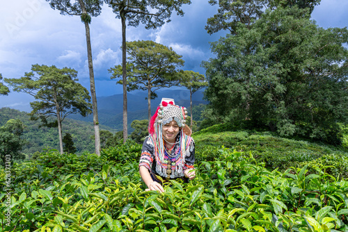 Hill tribe Asian woman in traditional clothes collecting tea leaves with basket in tea plantations terrace, Chiang mai, Thailand collect tea leaves