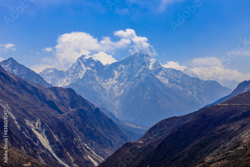 Himalaya mountains landscape with high altitude snow and ice glacier summit peaks. Everest Base Camp Solo Khumbu trekking region in Nepal. Beautiful Himalayas eight thouthander summits under blue sky