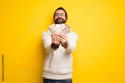 flower child, lifestyle, bohemian, hipster, style, hat, dreadlocks, adult, attractive, vision, guy, photogenic, hispanic, goggles, man, man, people, person, portrait, slim, studio, young, beard, optical, casual attire, money, cash, business, dollar, currency, paper, bill, banking, success, savings, bank, salary, abundance, smile, laugh, happy, happiness, expression, gesture, good, positive