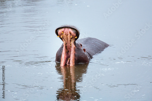 Hippopotamus (Hippopotamus amphibius); bull showing territorial behavior by yawning, Kruger national park South-Africa
