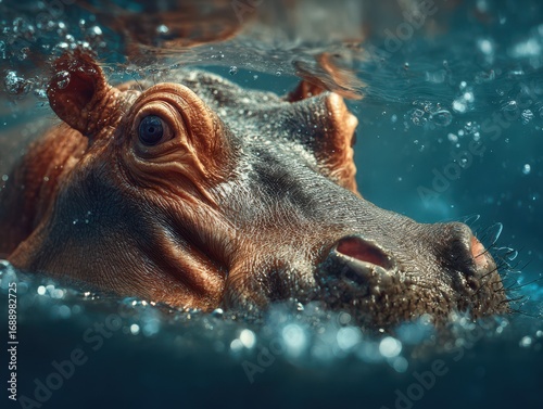 Hippopotamus swimming in clear water with bubbles rising around its face in a vibrant aquatic setting
