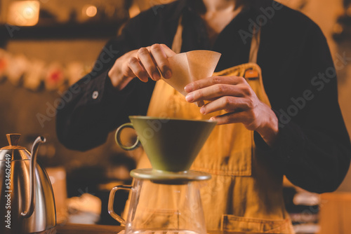 hipster barista making a drink coffee with drip or filter style by pouring hot water to brew a caffeine beverage from black bean in cafe restaurant business shop, using paper for aroma to a cup or mug