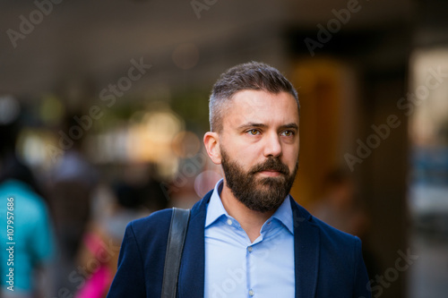young, people, lifestyle, urban, 30s, man, businessman, business, city, london, england, city life, hipster, beard, moustache, entrepreneur, blue, shirt, street, outside, british, walking, tied-up, jacket, manager, sunlight, commercial, photogenic, holding, corporate, professional, occupation, adult, public, person, modern, student, college students, pedestrian, smart, serious, blurred, closeup, detail, face