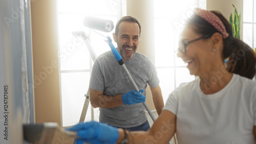 couple, hispanic, painting, home, together, living, room, renovation, love, interior, happy, family, indoor, smile, teamwork, middle, age, man, woman, glove, roller, brush, apartment, new, light, window, activity, fun, project, house, decor, improvement, bonding, human relationships, partner, domestic, space, togetherness, husband, wife, relax, creative, indoor, refresh, cheerful, smiling, mature, paint, decorating